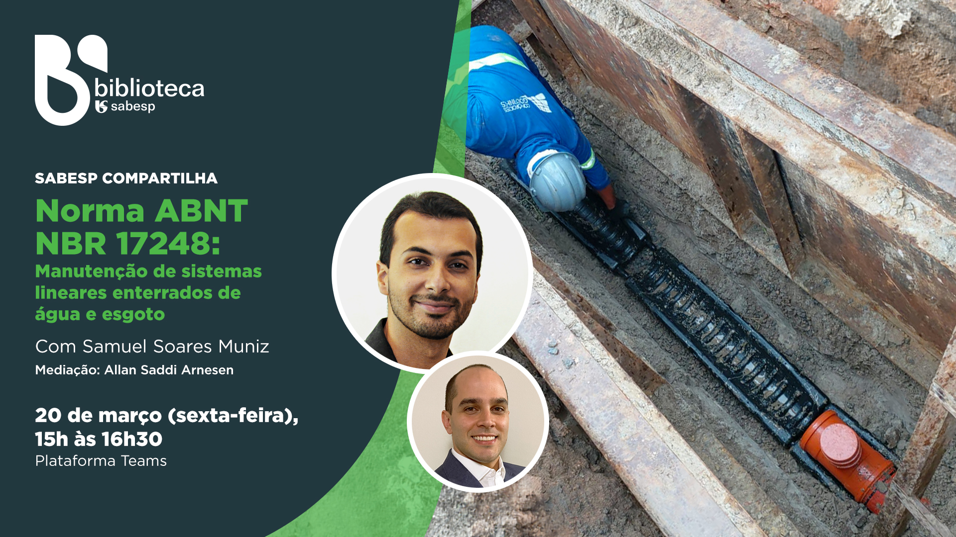 No dia 20 de março, das 15h às 16h30, a Sabesp promove mais uma edição do programa Sabesp compartilha, com a apresentação da ABNT NBR 17248 – Manutenção de sistemas lineares enterrados de água e esgoto. A atividade será realizada de forma online, via Microsoft Teams, e é voltada aos funcionários da companhia.
