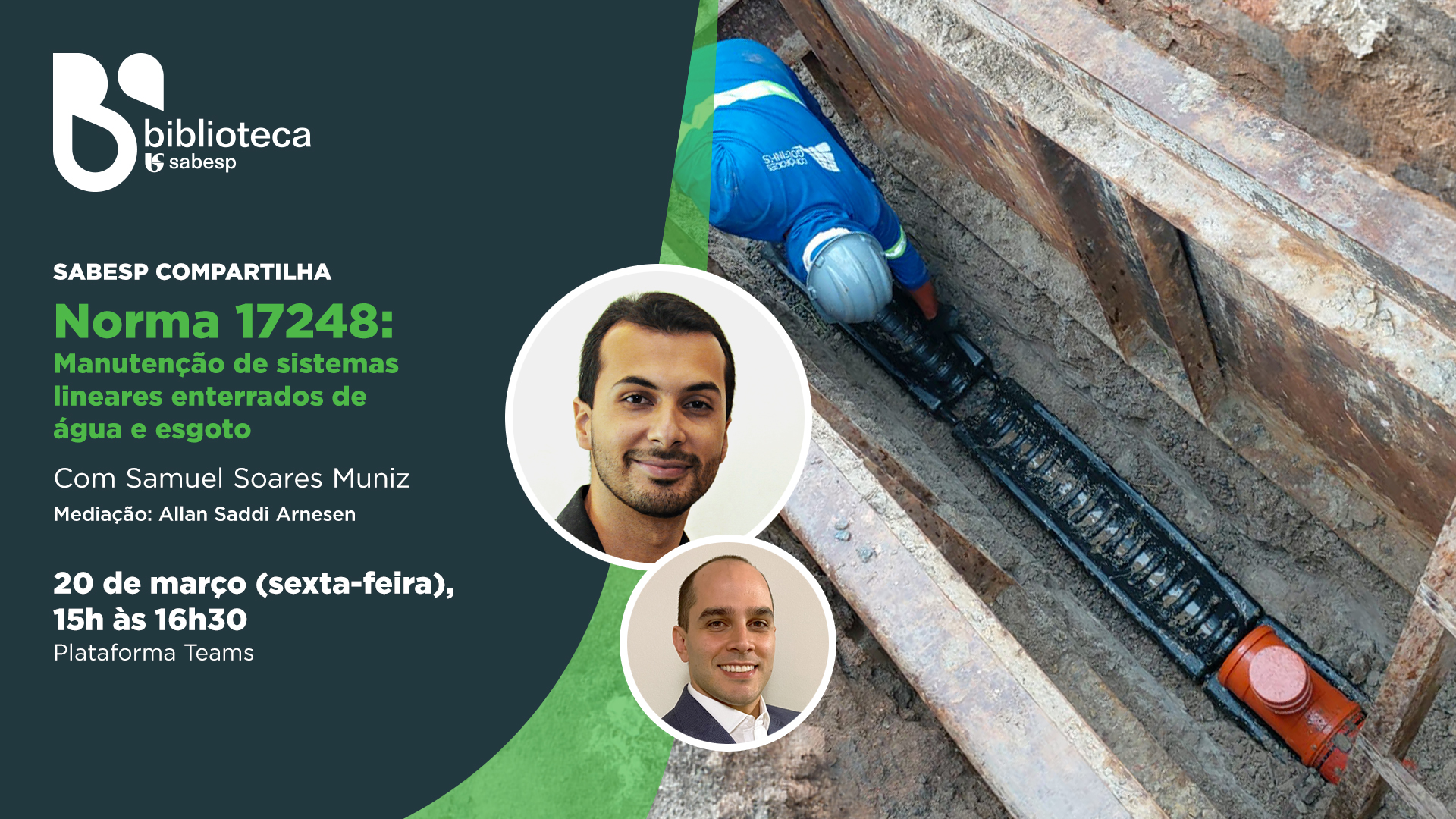No dia 20 de março, das 15h às 16h30, a Sabesp promove mais uma edição do programa Sabesp compartilha, com a apresentação da ABNT NBR 17248 – Manutenção de sistemas lineares enterrados de água e esgoto. A atividade será realizada de forma online, via Microsoft Teams, e é voltada aos funcionários da companhia.